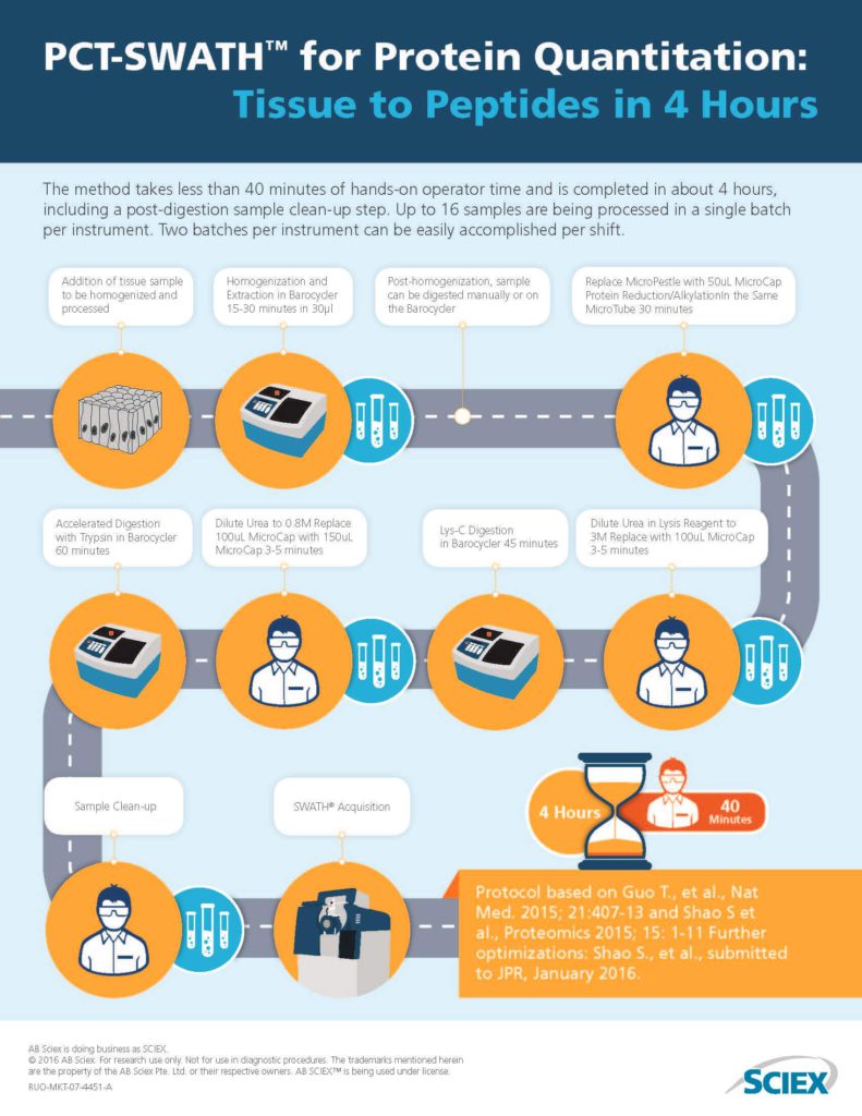 How it’s done!Pressure Cycling Technology (PCT) Sample Preparation Systems utilize controlled cycles of pressure to break apart the tissue samples. Scientists see faster and improved sample processing, and a higher quality of results. When combined with SWATH® Acquisition, high quality protein quantitation results can be obtained on 1000s of proteins in 100s of samples. Thus, combining SWATH® Acquisition with PCT sample preparation makes reproducible proteome research feasible across the enormous diversity of complex biological samples.