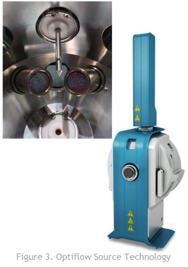 The recent introduction of OptiFlow technology allows the use of the Turbo V design to be translated to lower flow rate chromatography, such as nano and micro-flow rates. The benefit of lower flows can help with gains in sensitivity especially when you are ‘sample limited’. Significant research was done to develop a low-flow source that is sensitive while maintaining high robustness and ease of use of higher-flow sources. The result is an ion source, based on the legendary Turbo V design, with the ability to switch easily between nano and microflow regimes. No need to change the source, break vacuum and the system can be back up and running in minutes. Simple, robust and reliable. Figure 3 shows a picture of the Optiflow ion source based on the Turbo V geometry. Learn more about the legendary Turbo V ion source >