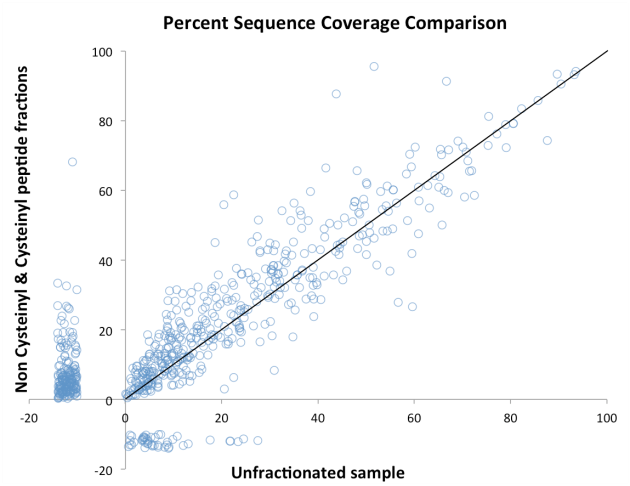 Identification results: One example of template use is for method development, one can compare the results from various methods (fractionation, acquisition, etc) and investigate the population of proteins found and the sequence coverage per protein found between the different methods.