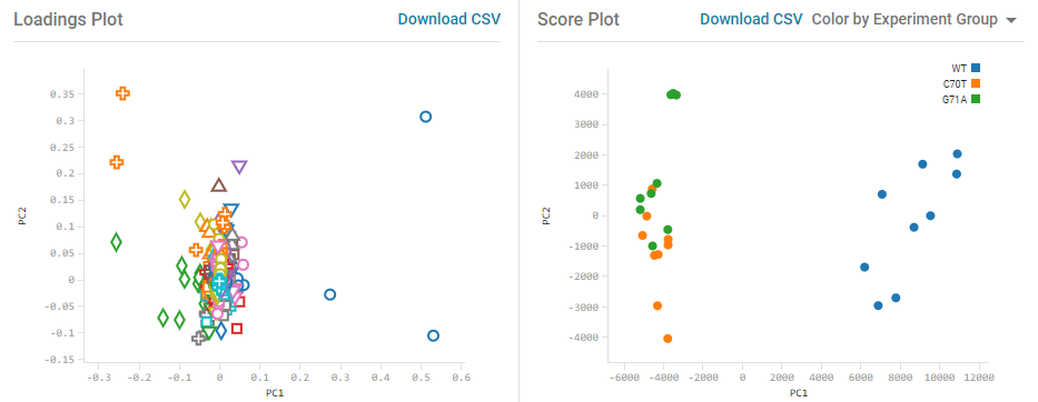 Principal component analysis (PCA) is a data transformation technique that can be used to reduce the complexity of high-dimensional data sets (such as mass spectrometry data) while retaining most of the variation in the data set. The MarkerView app also provides the ability to group these dimensions into a smaller number of groups with similar behavior to simplify visualization, using principal component variable grouping (PCVG). Results are visualized using the Scores and Loadings plots. The Scores plot shows groupings and differences among the samples (the precision of technical replicates, for example). The Loadings Plot shown displays the first 2 principal components (PCs) which typically explain the most important variables causing the separation of the sample groups.