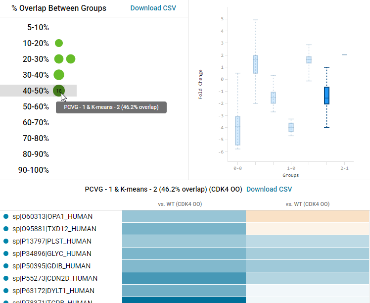 K-means clustering provides another means of identifying groups within a complex dataset. K-means clustering groups similar values (log2 fold change values or area values across samples), within a larger population of data, into smaller groups. This algorithm requires a clustering seed for the number of groups. The algorithm randomly picks k values from the observation values to serve as cluster seeds. Then, all of the observation values are grouped into k clusters based on their proximity to each of the cluster seed values. For each cluster group, a mean observation value is determined. Then, all of the observation values are re-grouped into k clusters based on their proximity to each of the cluster group mean seed values. The algorithm iterates through the cluster group mean seed values and proximity determination until there is no shift in cluster group assignment for each observation.
