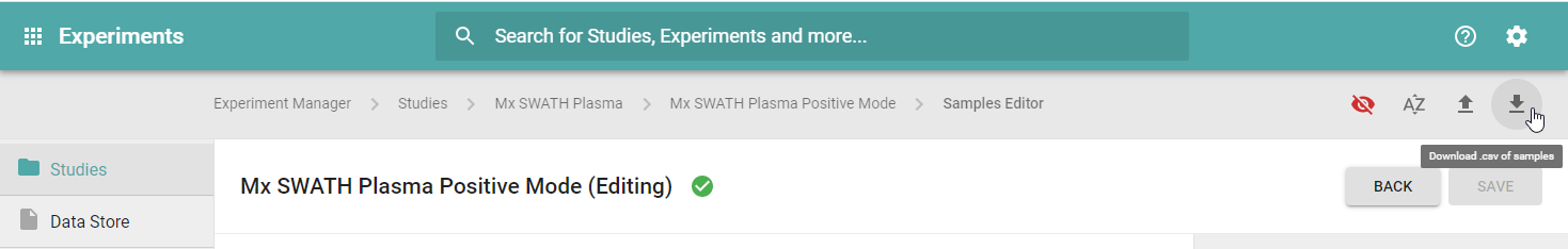 In the Experiments App within the OneOmics suite, metadata can be quickly assigned for large-scale studies using .csv files. To use .csv files for metadata assignment, first create a metabolomics or proteomics SWATH acquisition experiment and select .wiff files for processing. Then go to the metadata Samples Editor and click the download icon to download the .wiff file names into a .csv file (Figure 1). The .csv file will include columns for assigning metadata such as Experimental Group, Biological Group and Technical Group (for more information on replicate requirements in the OneOmics suite, please see this community post).