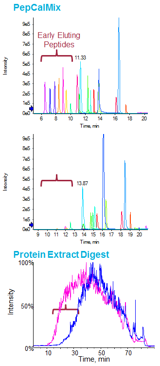 Test: Use PepCalMix LC-MS test to monitor binding of early eluting peptides. There are a number of very hydrophilic peptides in the PepCalMix which are great for testing the quality of trapping for your LC-MS experiment (IGNEQGVSR – 485.253 m/z, LVGTPAEER – 491.2656 m/z, AETSELHTSLK – 408.5501 m/z).